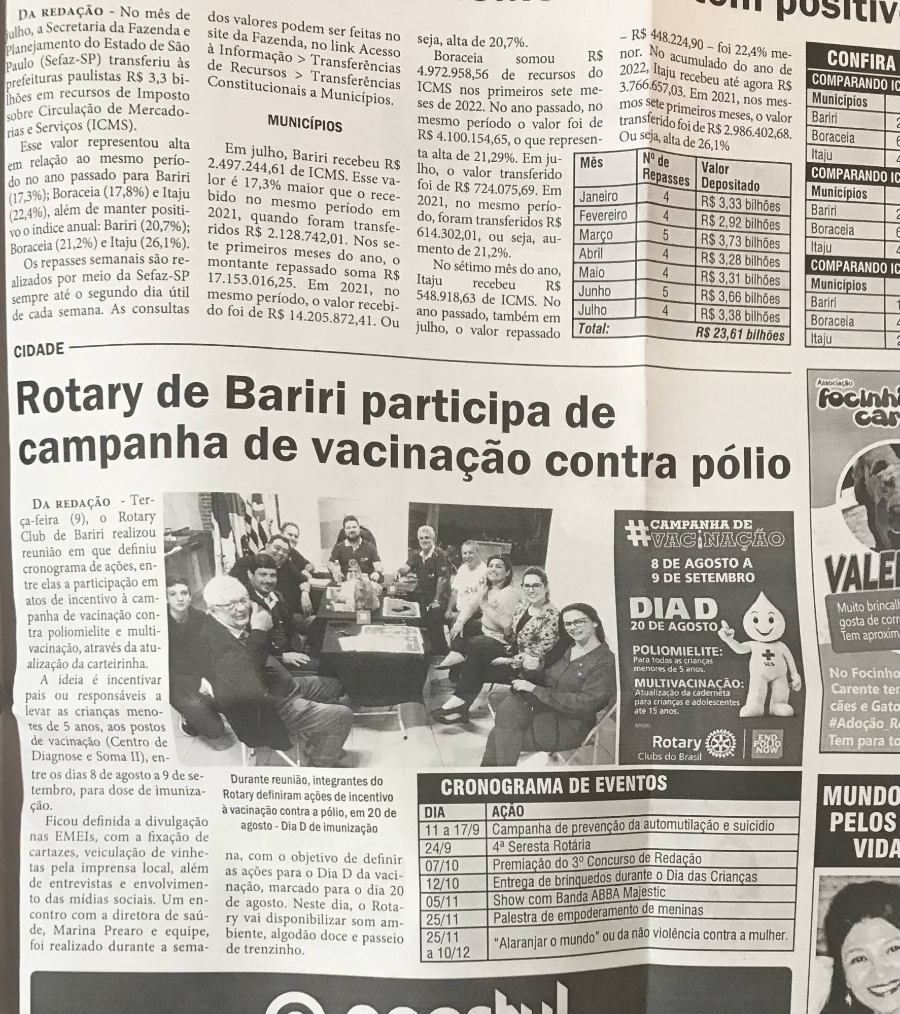 O Jornal local mais tradicional da cidade noticiou o calendário de atividades do RC de Bariri. A próxima ação do clube refere-se ao Dia D em que os associados disponibilizarão às crianças vacinadas algodão doce e passeio de trenzinho.
