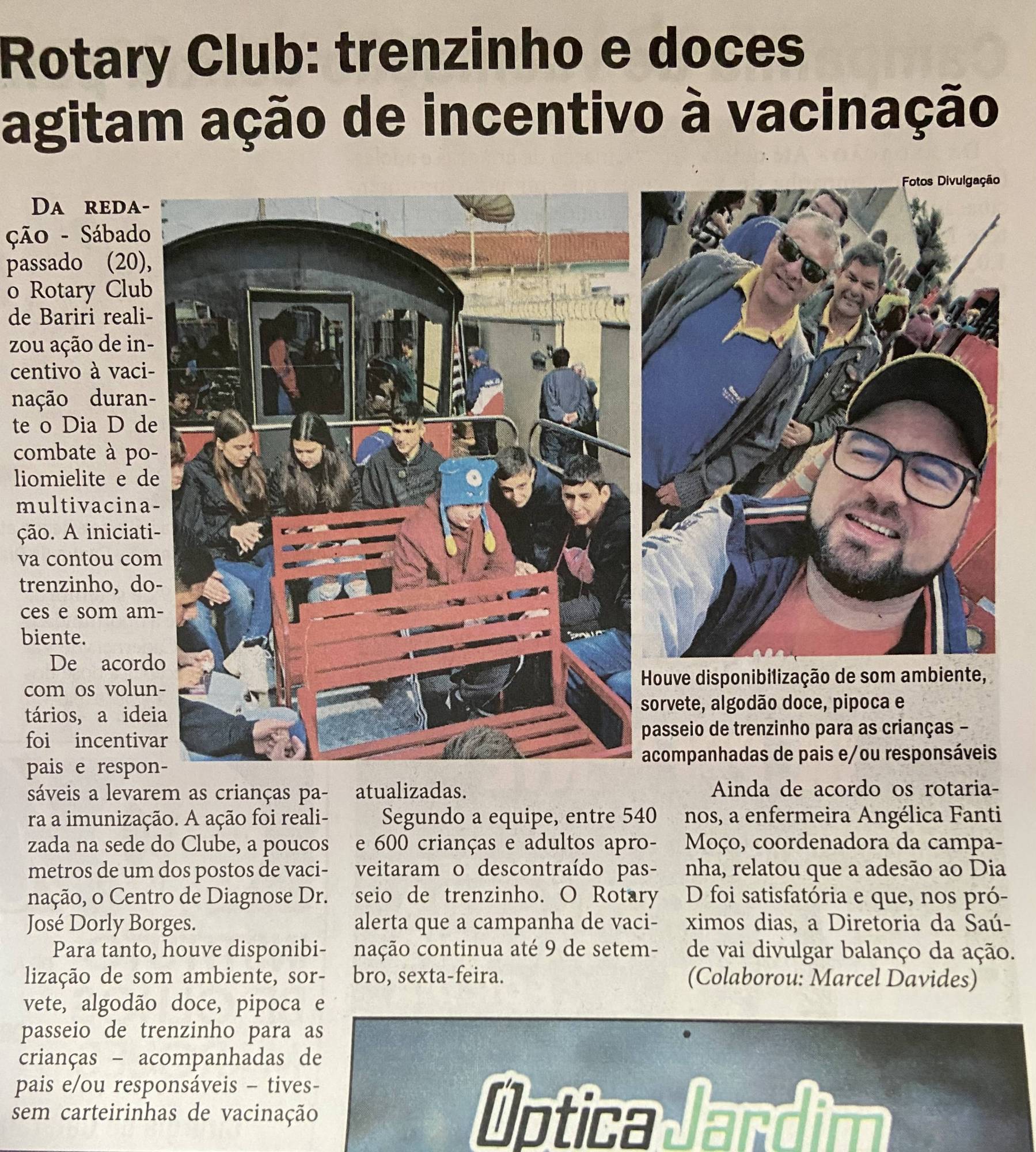 O Jornal Candeia de Bariri, noticiou nesse fim de semana, matéria sobre a ação do RC de Bariri durante o Dia D da vacinação, disponibilizando doces, pipoca e passeio de trenzinho para as crianças acompanhadas dos pais ou responsáveis. Foram mobilizadas por volta de 600 participantes e a adesão à vacina foi bastante satisfatória.