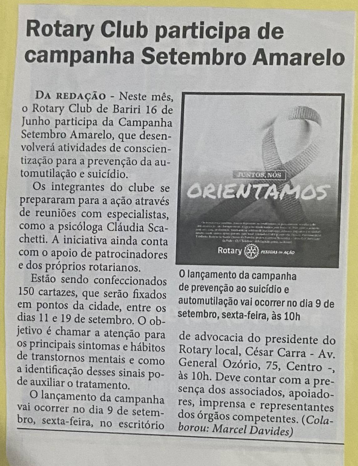 RC de Bariri tem matéria veiculada pelo Jornal Candeia, o jornal mais tradicional da cidade, dando destaque para as atividades do "Setembro Amarelo". Cartazes serão fixados em pontos estratégicos do município, e uma entrevista de lançamento da campanha foi agendada para o dia 9 às 10 h, contando com associados, convidados, profissionais apoiadores, como psicólogos, e imprensa.