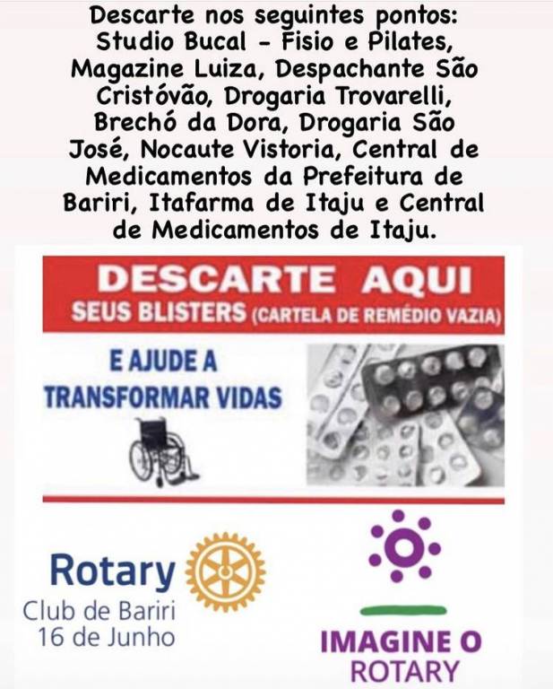 Em rápida entrevista concedida à 91 FM, o companheiro Marcel Devides atualizou os ouvintes sobre a campanha de arrecadação de blisters, os invólucros metálicos de medicamentos. A campanha segue com excelente adesão graça à contribuição dos municípes, parceiros, companheiros, comerciantes. Em breve, segundo Marcel, o primeiro carregamento será prensado e despachado para reciclagem e, em troca, uma cadeira de rodas, pelo menos, poderá ser obtida. Os pontos de troca estão indicados nas redes sociais do Rotary, Facebook e Instagram.