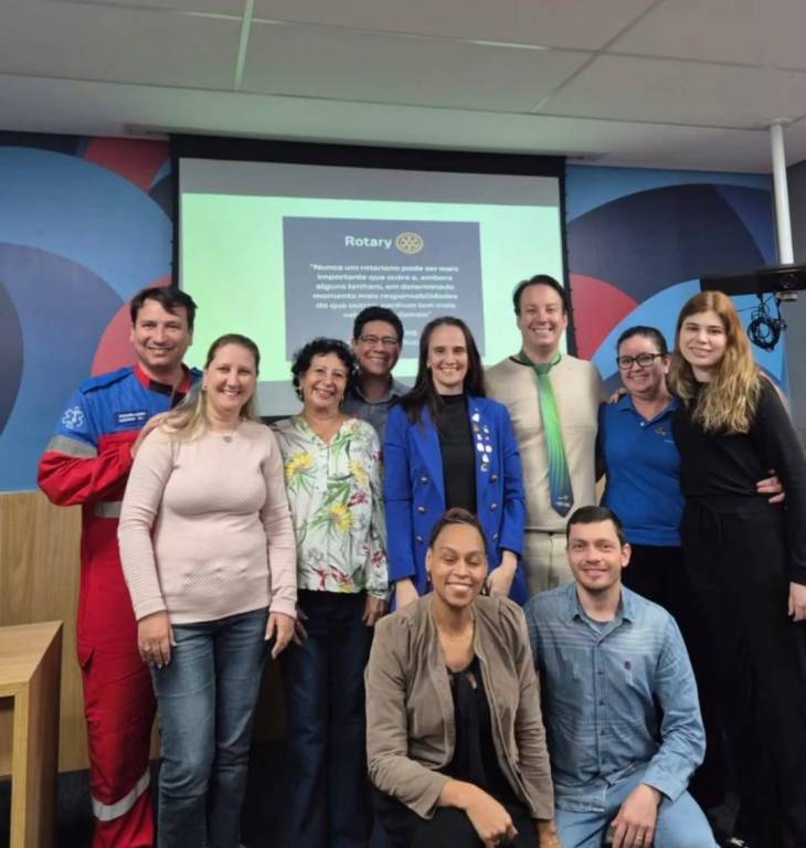 Foto de um grupo de dez pessoas, sendo seis mulheres e quatro homens, todos sorridentes. À frente um rapaz e uma moça estão agachados. O local que estão é fechado e com pouca iluminado, tendo atrás deles uma projeção em um telão que está em meio a uma parede toda colorida. Na projeção uma explanação com o tema Rotary.