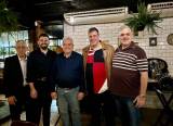 À direita, há um homem de barba, óculos e camiseta verde, ao lado de outro homem calvo, de óculos e camisa azul clara. Mais à direita, um homem de barba e camisa branca, e outro de bigode, camisa clara e cinto preto.