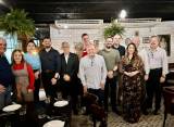 O grupo é composto por sete homens e seis mulheres, todos adultos. Eles estão posicionados em duas fileiras, com alguns mais à frente e outros atrás, para caberem na foto. A maioria está sorrindo, transmitindo um clima de alegria e descontração.