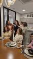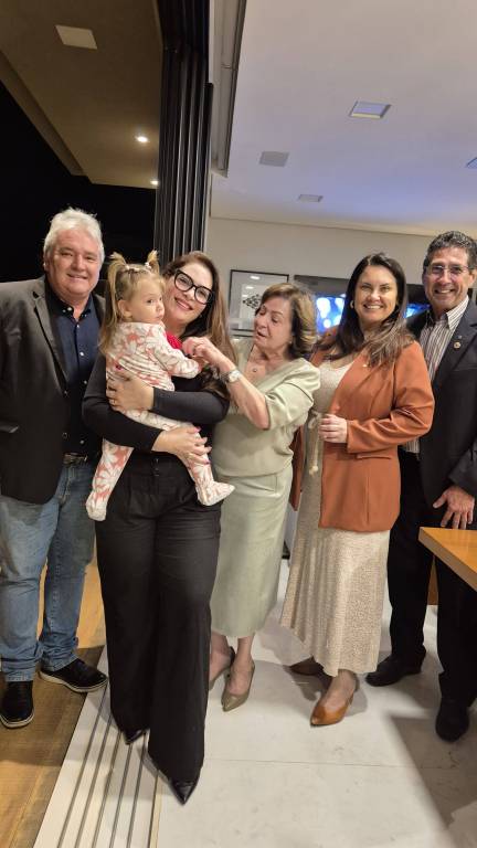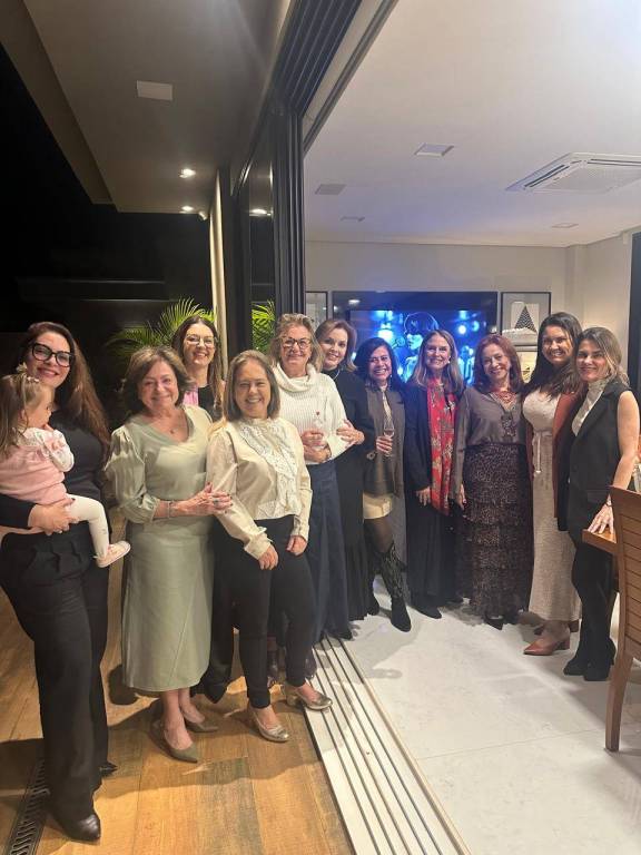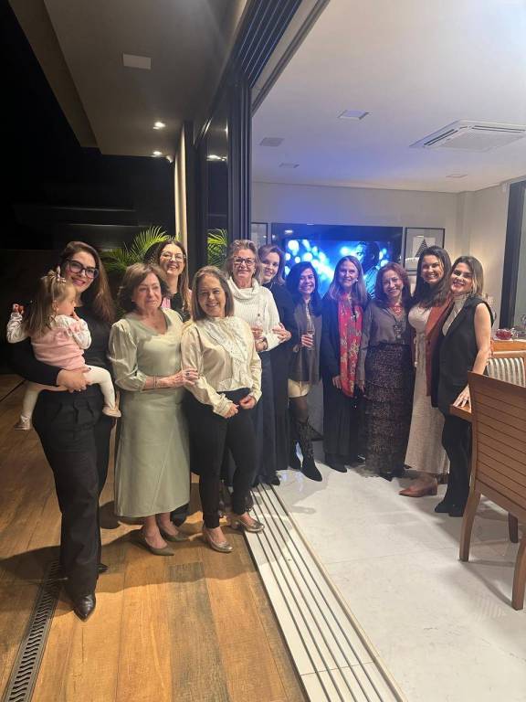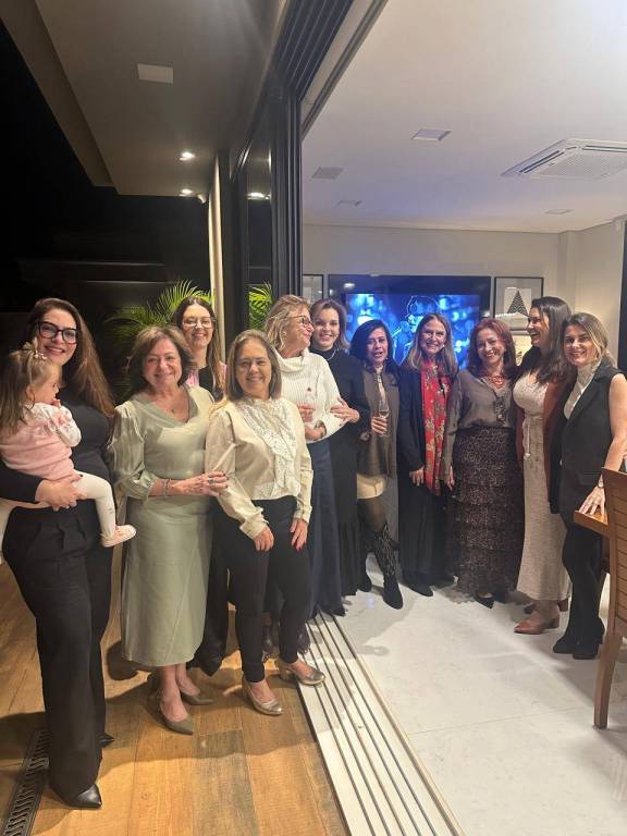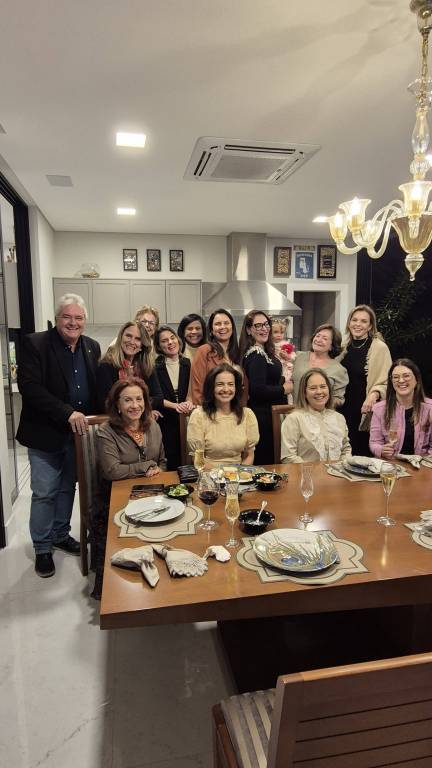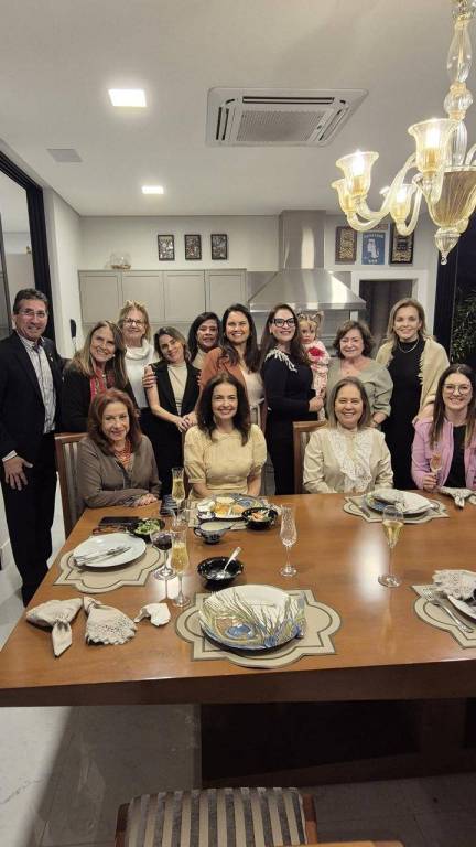 Grupo de pessoas sorrindo em uma confraternização em uma sala de jantar moderna. São doze mulheres e um homem, a maioria em pé atrás da mesa e três mulheres sentadas à mesa. Uma das mulheres em pé segura uma criança pequena. A mesa está posta com pratos, taças de vinho e champanhe, guardanapos e algumas tigelas com comida. O ambiente é bem iluminado, com lustre de vidro, decoração elegante e cozinha ao fundo. Todos parecem felizes e descontraídos, sugerindo um momento de celebração ou encontro especial.