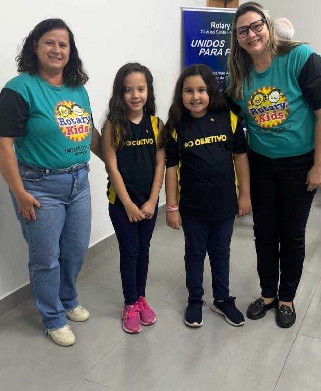 A imagem mostra um grupo de seis pessoas em pé, posando juntas. Quatro delas são adultas e duas são crianças. Os adultos vestem camisetas verde azuladas com o logotipo do Rotary Kids e a inscrição “Santa Fé do Sul-SP”. As crianças usam camisetas azul-marinho com a palavra “OBJETIVO” estampada na frente, indicando uma escola ou instituição educacional.