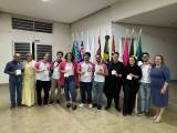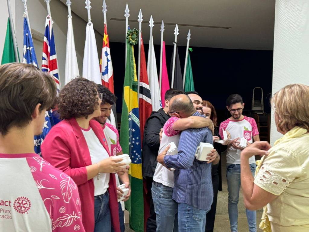 Foto com 11 pessoas posicionadas lado a lado. São jovens e adultos, homens e mulheres, todos sorridentes. Nos chama a atenção que seis jovens vestem camisetas brancas com detalhes em cor de rosa com a roda rotária iguais. A maioria segura das pessoas segura nas mãos uma miniatura de maletinha branca. Atrás deles paredes claras, um grande pavilhão de bandeiras e na esquerda uma porta de ferro com vidro entre aberta e acima uma vidraça com ferro também.