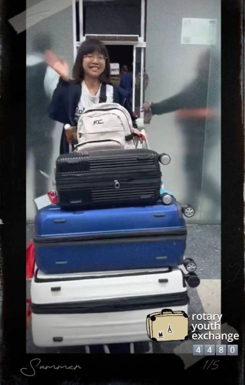 Uma fotografia vertical, granulada, com bordas desgastadas e estilo vintage. Uma jovem sorridente de cabelos escuros e óculos está no primeiro plano. Ela usa uma blusa preta, uma mochila creme nas costas com a sigla "FC" e acena com a mão direita. Atrás dela, uma pilha de quatro malas de rodinhas: a primeira, preta, com a alça estendida e uma mochila preta em cima; as duas seguintes, azuis; e a última, branca. As malas estão em um carrinho de bagagem. O chão é cinza e liso, e o fundo é um corredor de aeroporto com paredes cinzas. A sombra de uma pessoa é visível na parede. No canto inferior esquerdo, a palavra "Summer" está escrita em itálico. No canto inferior direito, um adesivo de mala com um desenho da Torre Eiffel e a frase "rotary youth exchange". Abaixo, um contador com os números "4480" e a fração "1/5".