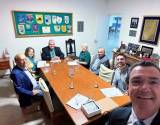 A imagem mostra sete pessoas, seis sentadas e uma em pé, em uma sala de reuniões. Elas estão ao redor de uma grande mesa de madeira escura.