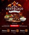O cartaz promocional anuncia o evento “4º Costelaço dos Rotary Clubs”. Ao centro, há uma imagem chamativa de uma costela assada, suculenta e dourada, servida sobre uma tábua de madeira. Ao lado, pratos com acompanhamentos típicos como arroz, feijão e legumes coloridos completam a composição gastronômica.