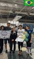 A imagem mostra um grupo de pessoas reunidas em um espaço público que se assemelha a um aeroporto. Elas estão sorridentes e seguram cartazes e balões coloridos, indicando que estão participando de uma recepção calorosa. Um dos cartazes diz “WELCOME to BRAZIL”, decorado com bandeiras e imagens diversas. Outro cartaz, com balões presos, traz a mensagem “WELCOME RONJA”.