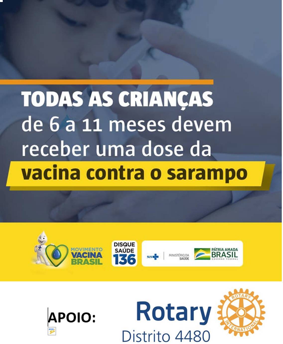 O governador do Distrito 4480 do Rotary International, Antonio Cavichia Filho, está incentivando todos os rotarianos do Distrito a divulgarem a vacinação contra o sarampo.