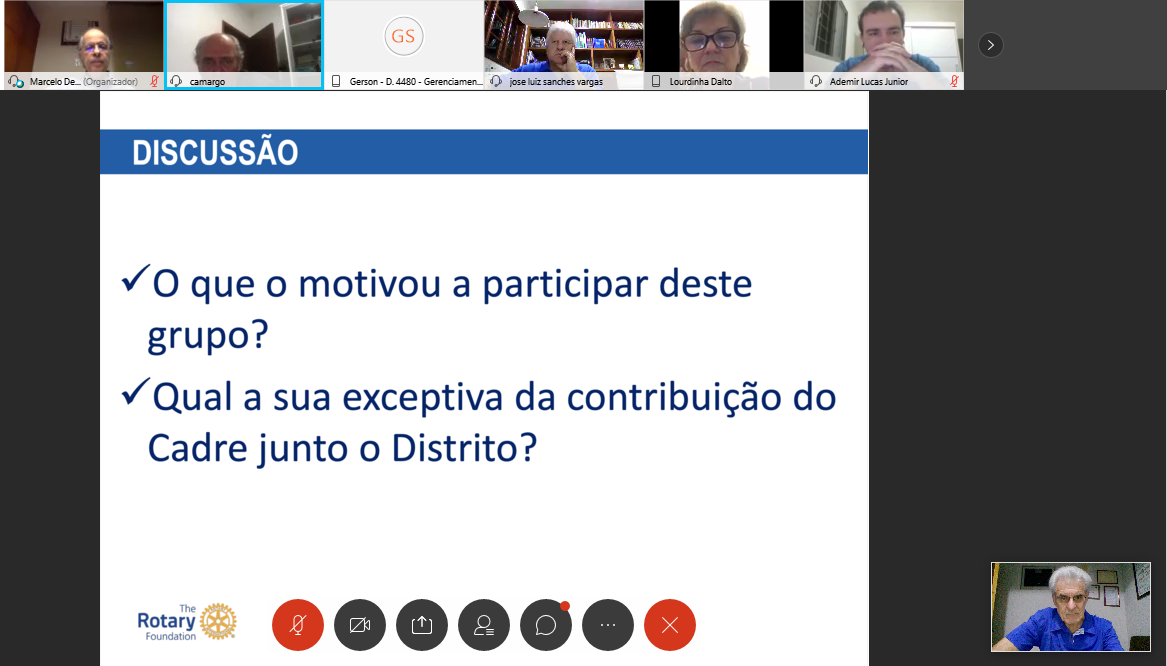 O Distrito 4480 realizou, na noite de quarta-feira, dia 15 de julho, a primeira etapa do treinamento sobre a Cadre, ou Equipe de Consultores Técnicos da Fundação Rotária, um grupo de rotarianos voluntários que fornecem orientações e conhecimentos técnicos a rotarianos que planejam e realizam projetos de subsídios do Rotary no mundo todo. O Seminário foi ministrado por Marcelo Haick e teve a coordenação da governadora Lourdinha Dalto (2020-21) e do governador José Luiz Sanches Vargas (200708). Além das informações sobre suporte técnico, foram destacados que os projetos de subsídios globais continuam com valor mínimo de US$ 30 mil; que o Fundo Mundial não mais repassará os recursos equivalentes ao investimento do projeto e que os parceiros internacionais podem investir no mínimo 15% do valor do projeto (antes era 30%). Os participantes aprovaram o treinamento, pois receberam uma gama de informações que muito vão contribuir para a elaboração de futuros projetos. Nesta sexta-feira, dia 17, haverá o segundo módulo e na terça-feira, dia 21, o terceiro.
